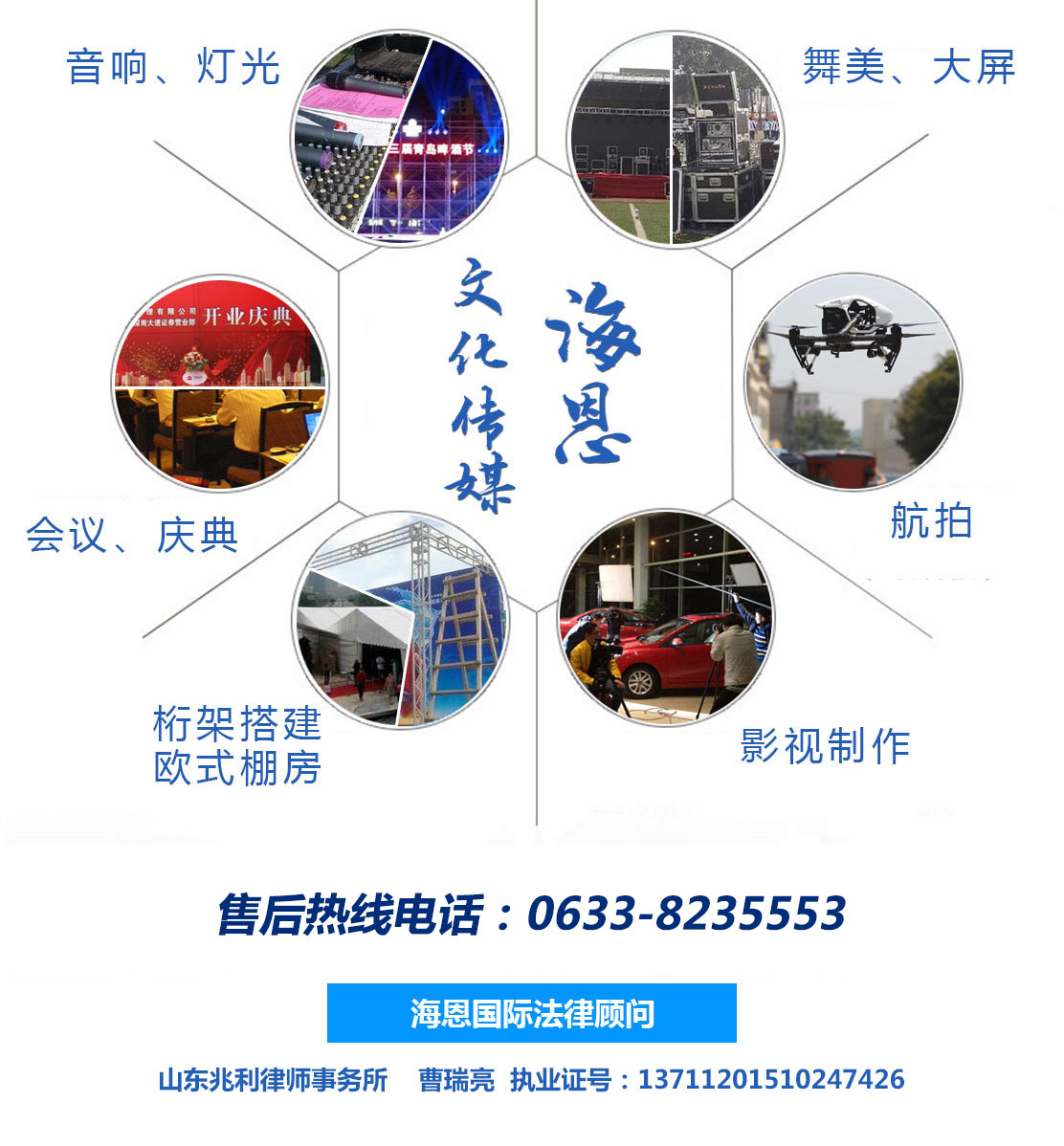 日照海恩國際展覽股份有限公司主要經(jīng)營:為文化藝術(shù)交流提供服務(wù),攝影攝像服務(wù),廣告圖文設(shè)計,舞臺設(shè)計,文化藝術(shù)交流策劃,舞臺藝術(shù)造型策劃,企業(yè)營銷策劃,商務(wù)信息咨詢,會議服務(wù),展覽展示服務(wù),禮儀慶典服務(wù),廣告設(shè)計制作等產(chǎn)品。公司尊崇“踏實、拼搏、責(zé)任”的企業(yè)精神,并以誠信、共贏、經(jīng)營理念,創(chuàng)造良好的企業(yè)環(huán)境,以全新的管理模式,完善的技術(shù),周到的服務(wù),我們始終堅...